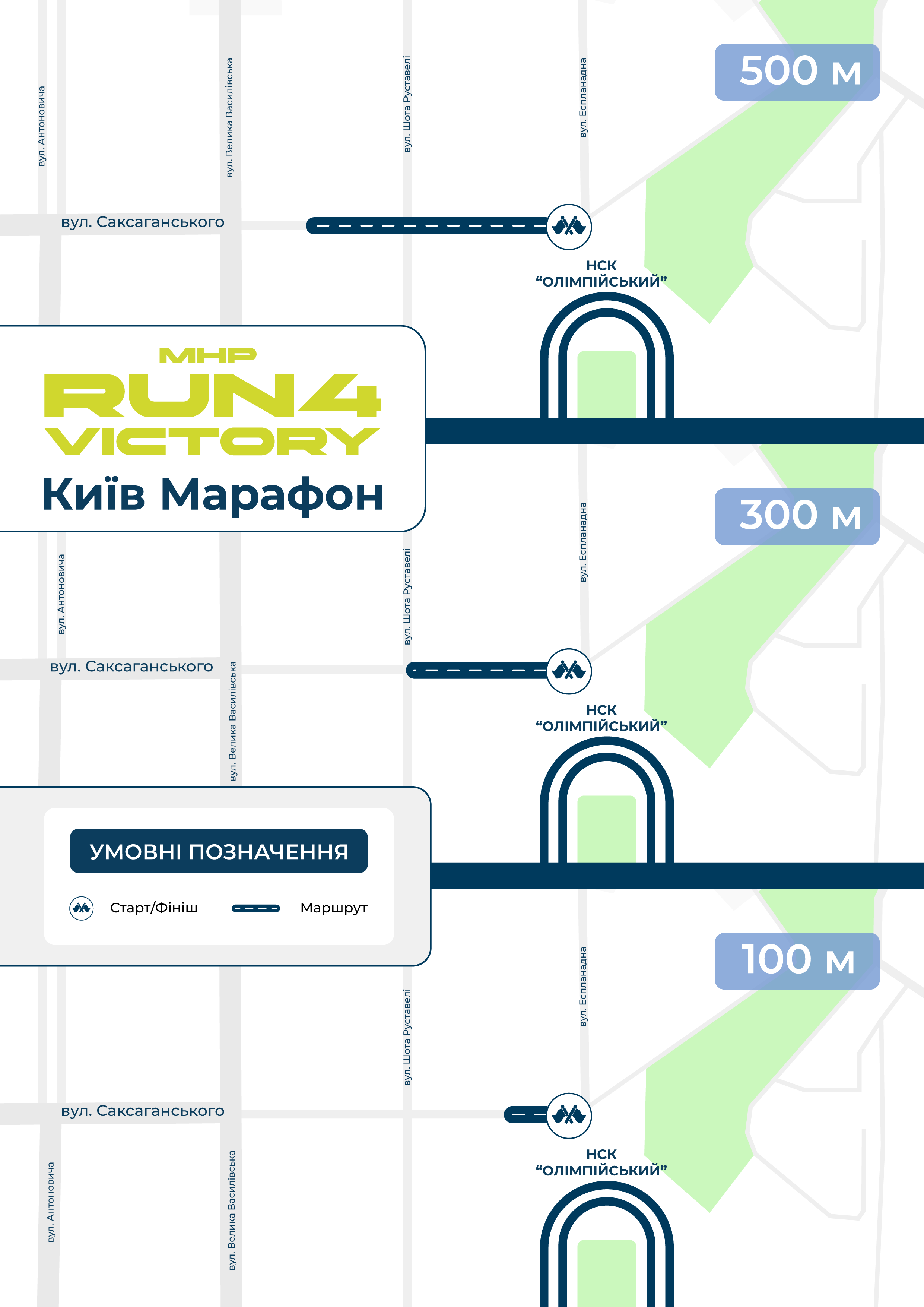Короткі дистанції проходитимуть по вулиці Саксаганського: 5 км — до Галицької площі, 2 км — до вул. Тарасівської. Дитячі дистанції — 500 м, 300 м і 100 м — також пролягатимуть вулицею Саксаганського.