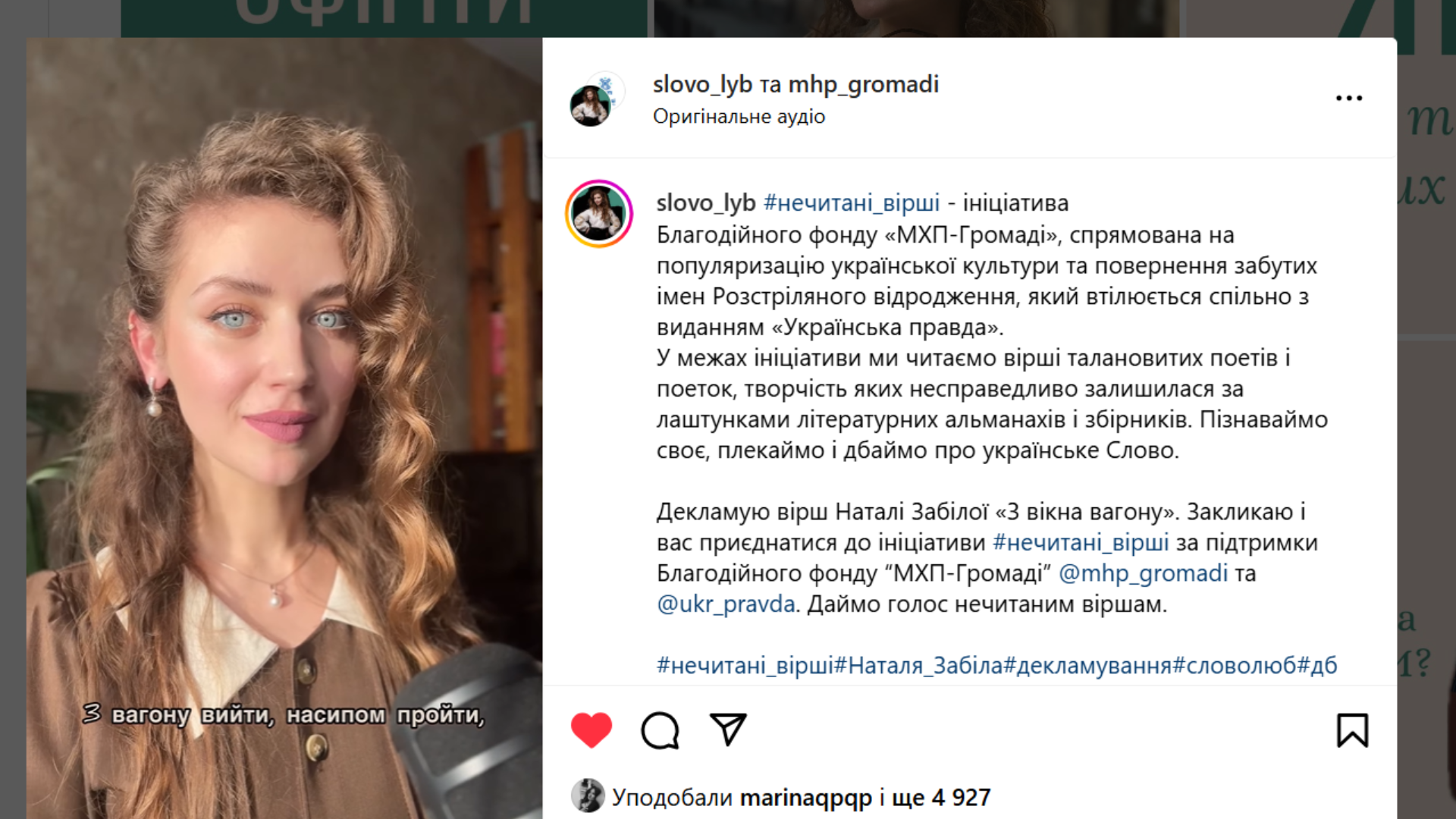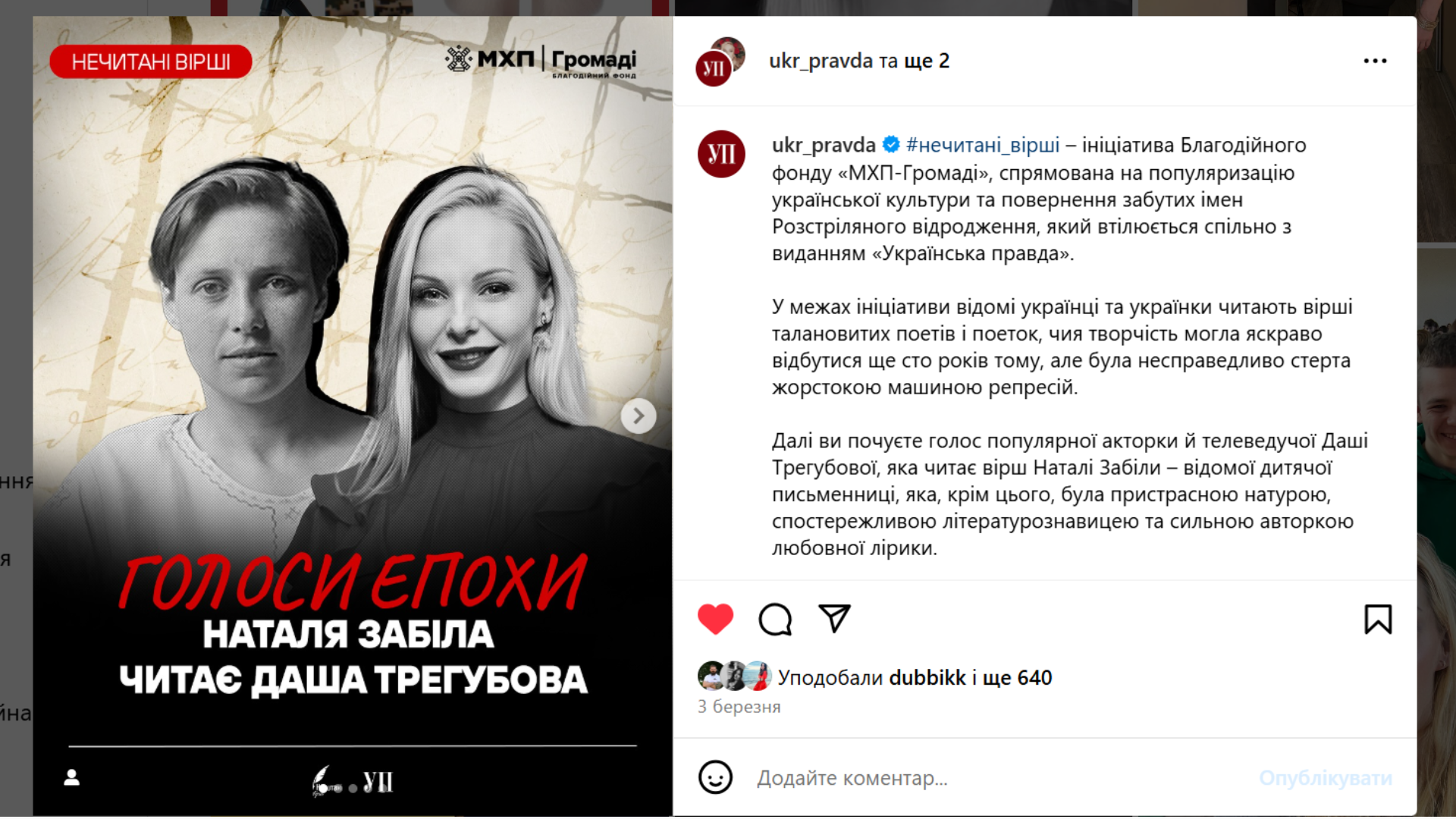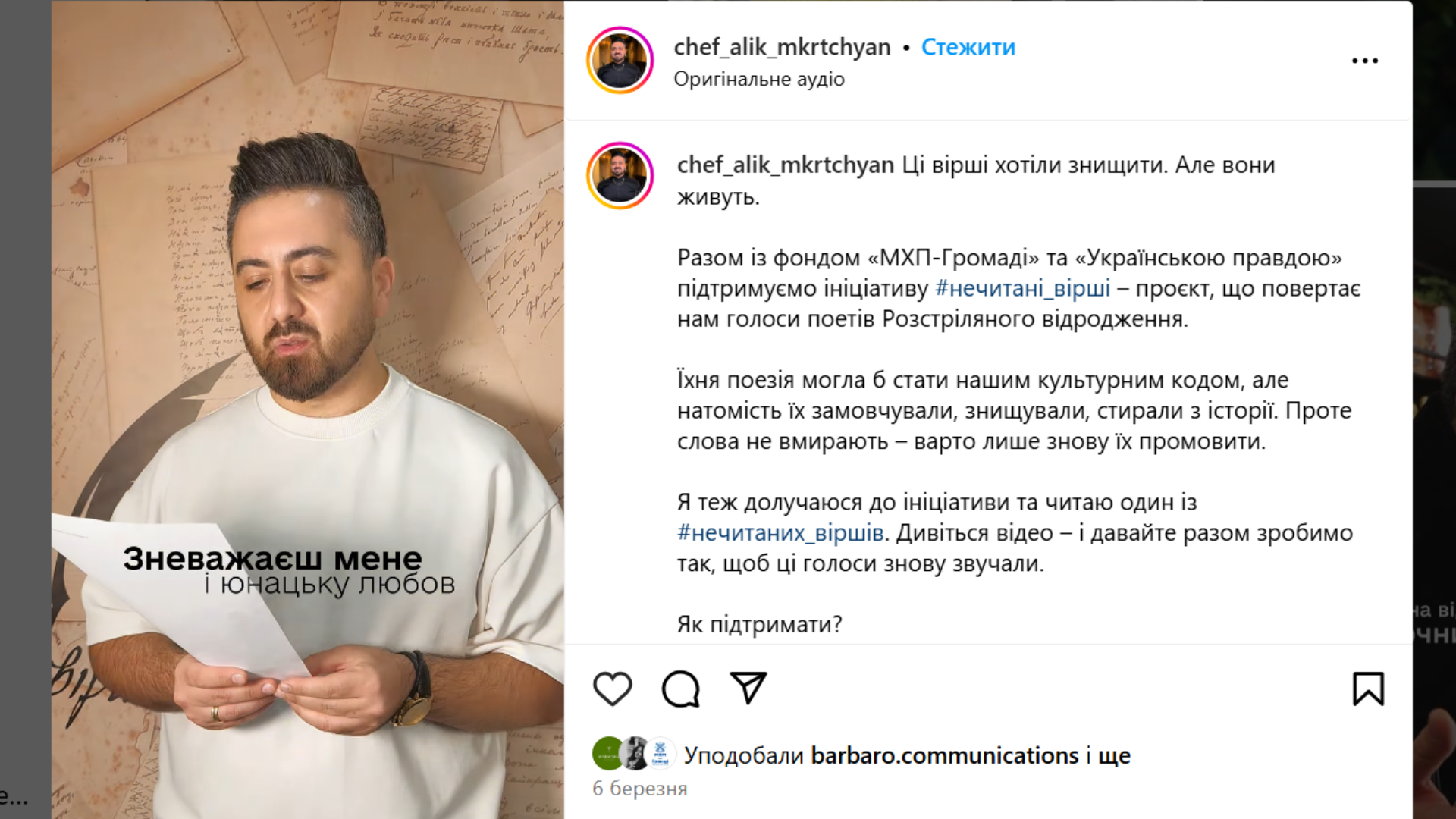 #нечитані_вірші – ініціатива Благодійного фонду “МХП-Громаді”, яка втілюється спільно з виданням “Українська правда”. У межах проєкту вдалося повернути голос несправедливо забутих митців та мисткинь 1930-х років: Майка Йогансена, Ладі Могилянської, Амді Гірайбая, Леоніда Чернова та інших. Для цього відомі письменники, музиканти, актори, волонтери (Сергій Жадан, Даша Трегубова, Андрій Ісаєнко, Тата Кеплер, Севгіль Мусаєва) начитали їхні вірші, а команда проєкту оформила аудіозаписи в подкасти. Вони доступні на платформах YouTube, Spotify, Apple Podcast, а відтепер і на MEGOGO .