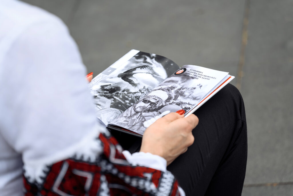 To create its powerful visual storytelling, Serhiy drew from his personal photo archive, including images from battles in Donbas, the Revolution of Dignity, and photographs from the front lines captured by soldiers and war correspondents. The illustrations also include excerpts from Shevchenko’s works along with paintings from the The Cossack Family Has No End series.